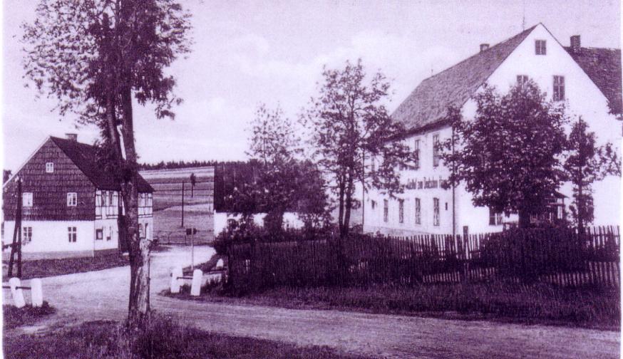 Ansichtskarte oben: Das Haus links war die gemeinsame Zolleinahme. Vor 1918 war es deutsch und von böhmischer Seite von k.u.k. Monarchie. Die linke Seite beherbergte die Wohnung und den Dachboden des sächsischen Zolleinnehmers, die rechte Haushälfte die des k.u.k. Einnehmers. Die Grenzbrücke ist zu erkennen. Der Teich im Vordergrund gehörte zur ehemaligen Brettschneiderei Kreher. Das Bild unten rechts ist mein Elternhaus, das Gasthaus "Zur Quelle". In diesem Haus wurde ich geboren. Ich mußte von dort im Februar 1946 mit meiner 66jährigen Mutter fliehen. |