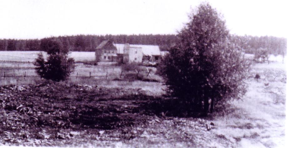 Im Jahre 1950 waren von Ulmbach nur noch dieses Häuflein Häuser übrig geblieben. Der übrige Ort wurde wegen seiner Grenznähe abgerissen. Sie sehen den Rest vom "Deutschen Haus", dahinter das Wohnhaus mit Stall und Scheune. |