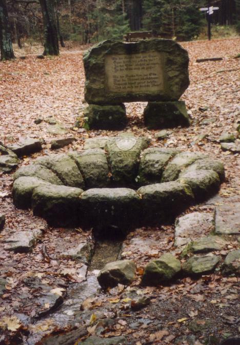 Unmittelbar südlich der Quellfassung ruht ein rechteckiger Granitblock auf zwei Steinwürfeln mit untenstehender Inschrift. Die Melodie hören sie mit nachstehendem Link. Klicken Sie auf die erste Zeile des Textes: